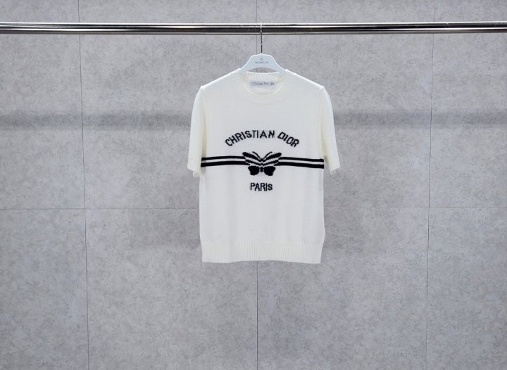 화이트 캐시미어 니트 소재로 제작되었으며, 그래픽적인 매력을 더한 블랙 크리스찬 디*올 파피용 모티프가 돋보입니다. 짧은 소매와 골지 트리밍이 스웨터를 완성하며, 사계절 내내 어떤 룩에도 잘 어울립니다.