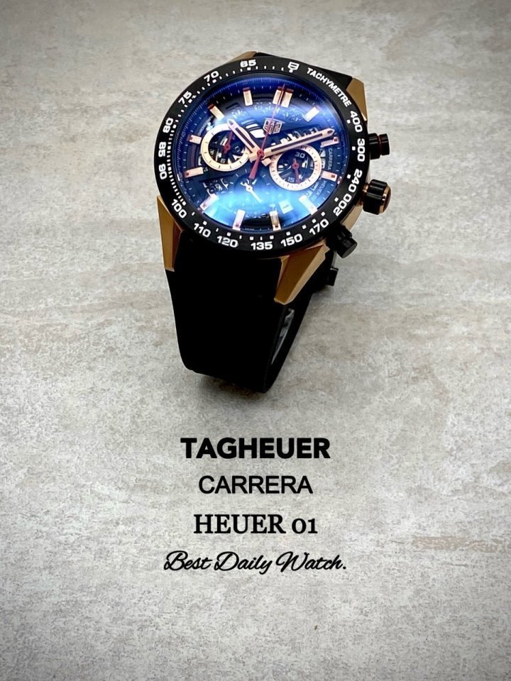 카레이싱에서 영감을 얻은 클래식 하면서도 현대적인 스포츠시계인 까레라 칼리버 호이어 01 크로노 그래프입니다 블랙베젤과 태그호이어 특유의 블랙펀칭 러버스트랩의 조화가 고급스러움을 더합니다 데일리 워치로 강추합니다 고급 케이스 포함