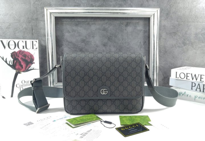 그레이/블랙 수프림 텐더 캔버스 그레이 레더 트리밍 코튼 리넨 안감 더블 G 내부: 지퍼 포켓 1개 외부: 지퍼 포켓 1개, 마그네틱 스냅 포켓 2개 조절 가능한 숄더 스트랩, 47cm 드롭 마그네틱 플랩 클로저
