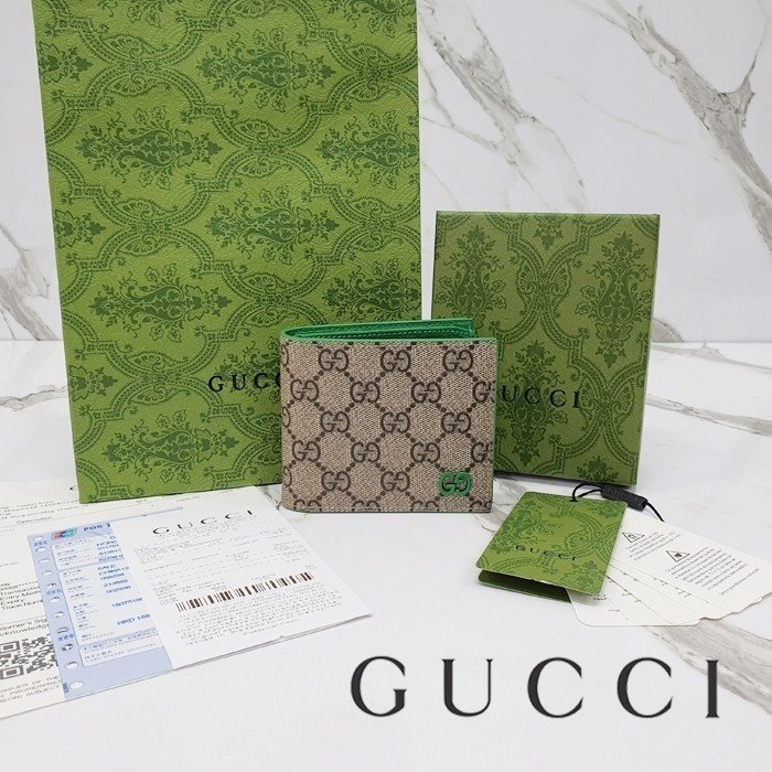 🔘색상 : 베이지&그린레더 🔘사이즈 : W11cm x H9cm 🔘기타정보 : -제품 NO. 768243 -남성용 반지갑 -소재 GG 수프림 캔버스/최고급 소가죽 -포켓 지폐2/카드8/보조2 -본품+더스트+박스+책자+영수증+쇼핑백 풀구성