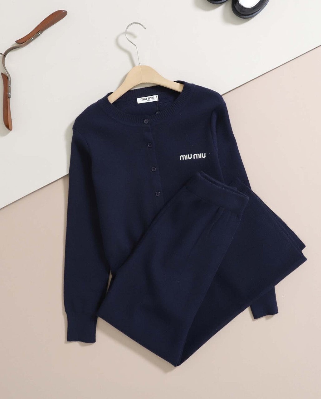 [국내배송]미우미우 [ miu ] 수입 스몰 레터링 라운드넥 가디건 & 니트 와이드 팬츠 set