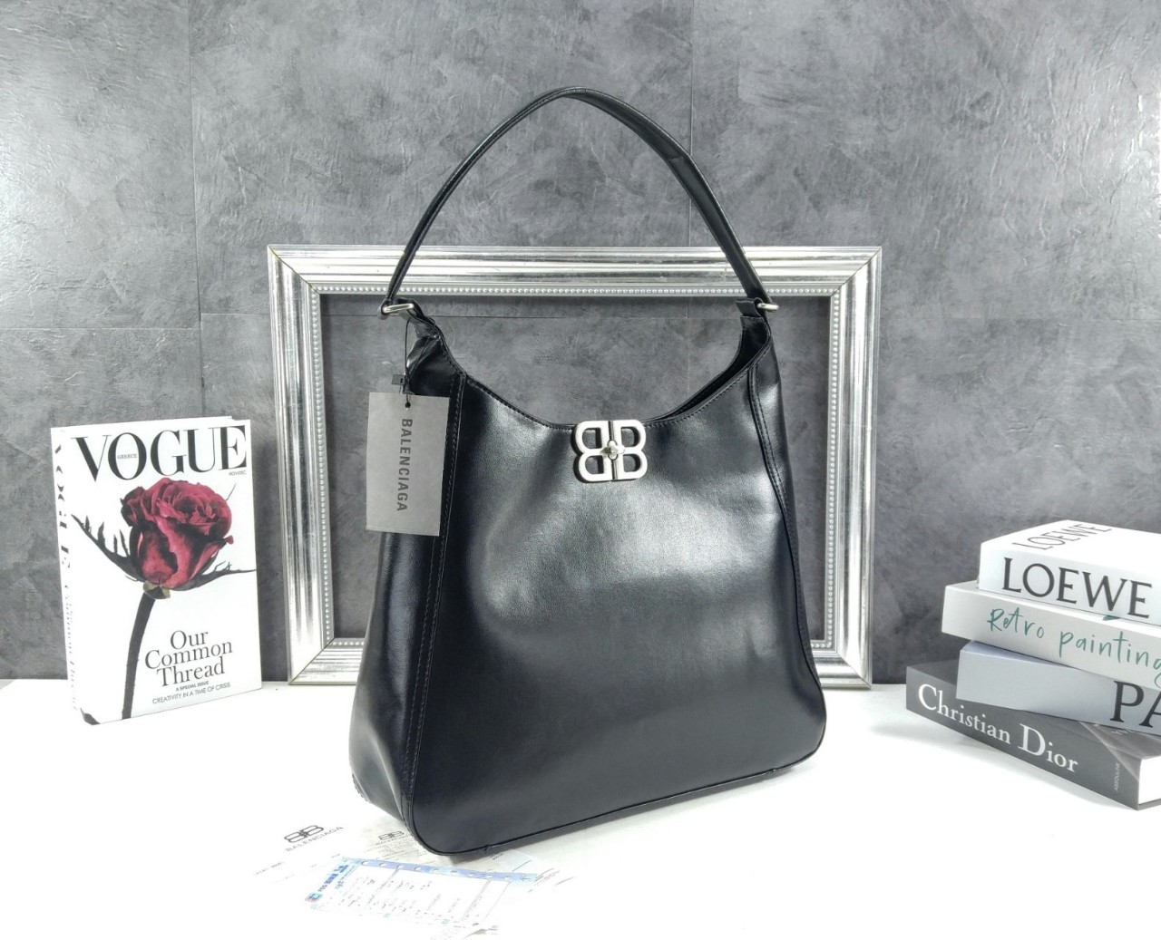 블랙 송아지 가죽 호보 백 핸들 숄더 캐리 에이지드 실버 BB 로고 하드웨어 턴락 잠금 장치 메인 수납 공간 1개 내부 지퍼포켓 1개 탈부착 길이조절 가능 스트랩