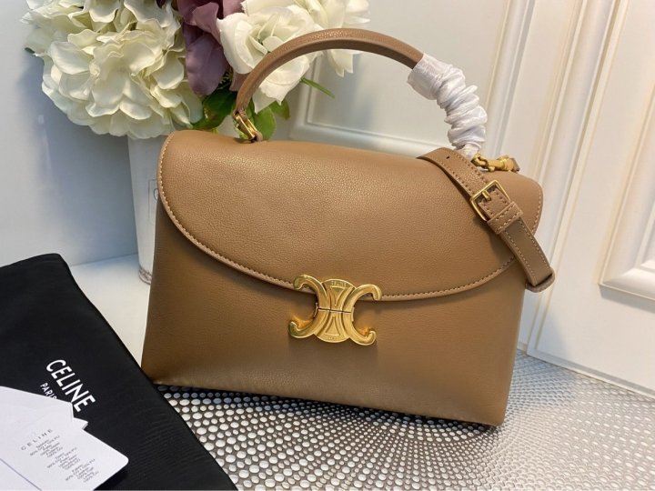 골드 피니시 핸드백, 숄더백 및 크로스바디백으로 착용 가능 트리옹프 메탈 잠금장치 수납공간 2개 내부 플랫 포켓 3개 내부 중앙 지퍼 포켓 1개 가죽 핸들 1개 탈부착 및 길이 조절 가능한 스트랩 1개