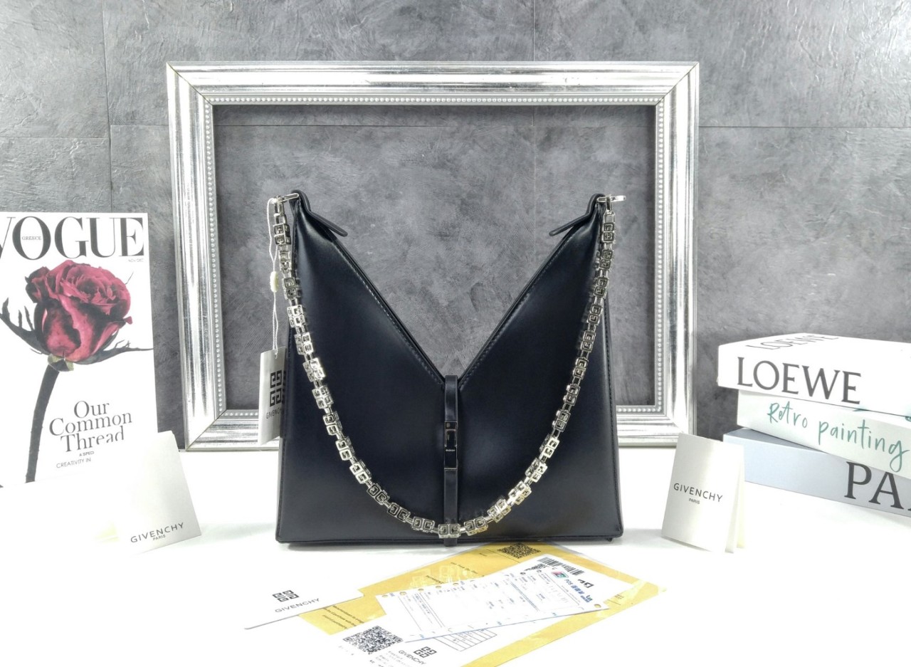 마그네틱 프레스 릴리스 클로저. 내부의 베이지 색상 버프 양가죽 안감. 실버 톤 하드웨어과 체인이컷아웃 백의 독특한 디자인.