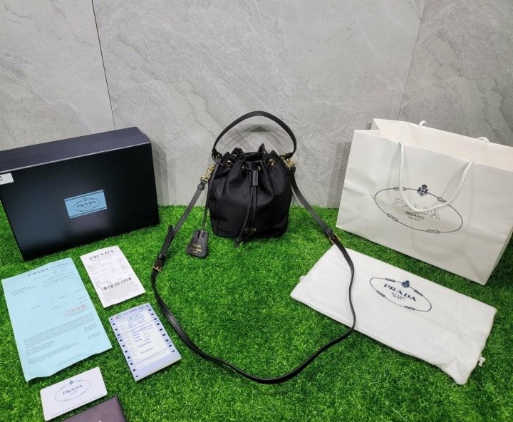 프라다 여성 리나일론 버킷백 입고 되었습니다 현재 아주 핫한 제품으로 ZEN역시 웨이팅이 필요할 정도로 인기제품 입니다. 퀄리티는 현존 최고로 ZEN급입니다. 선물용으로 너무 좋은제품 입니다. 사진동일 케이스, 더스트, 쇼핑백, 풀구성 출고 입니다